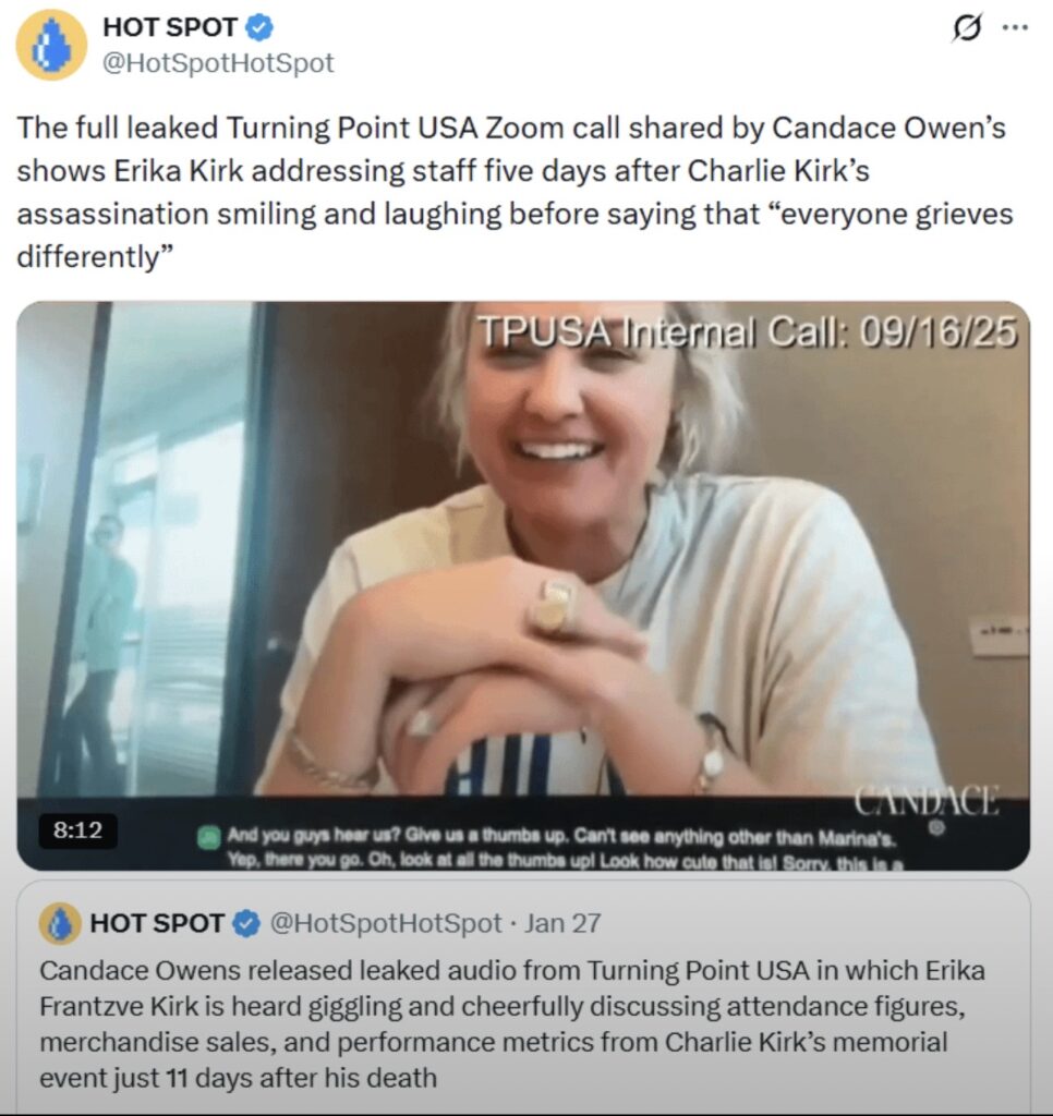 After Charlie Kirk’s assassination in September 2025, Erika Kirk assumed the role of TPUSA CEO, framing it as a duty to her husband’s legacy. In media appearances with figures like Bari Weiss and Andrew Ross Sorkin, she has worked to reshape his public image as a “peacemaker,” largely avoiding detailed discussion of the organization’s policy goals. This transition has occurred alongside internal turmoil, with podcaster Candace Owens—a former TPUSA contributor—releasing leaked audio and fueling speculation about Kirk’s leadership and the circumstances of her husband’s death.