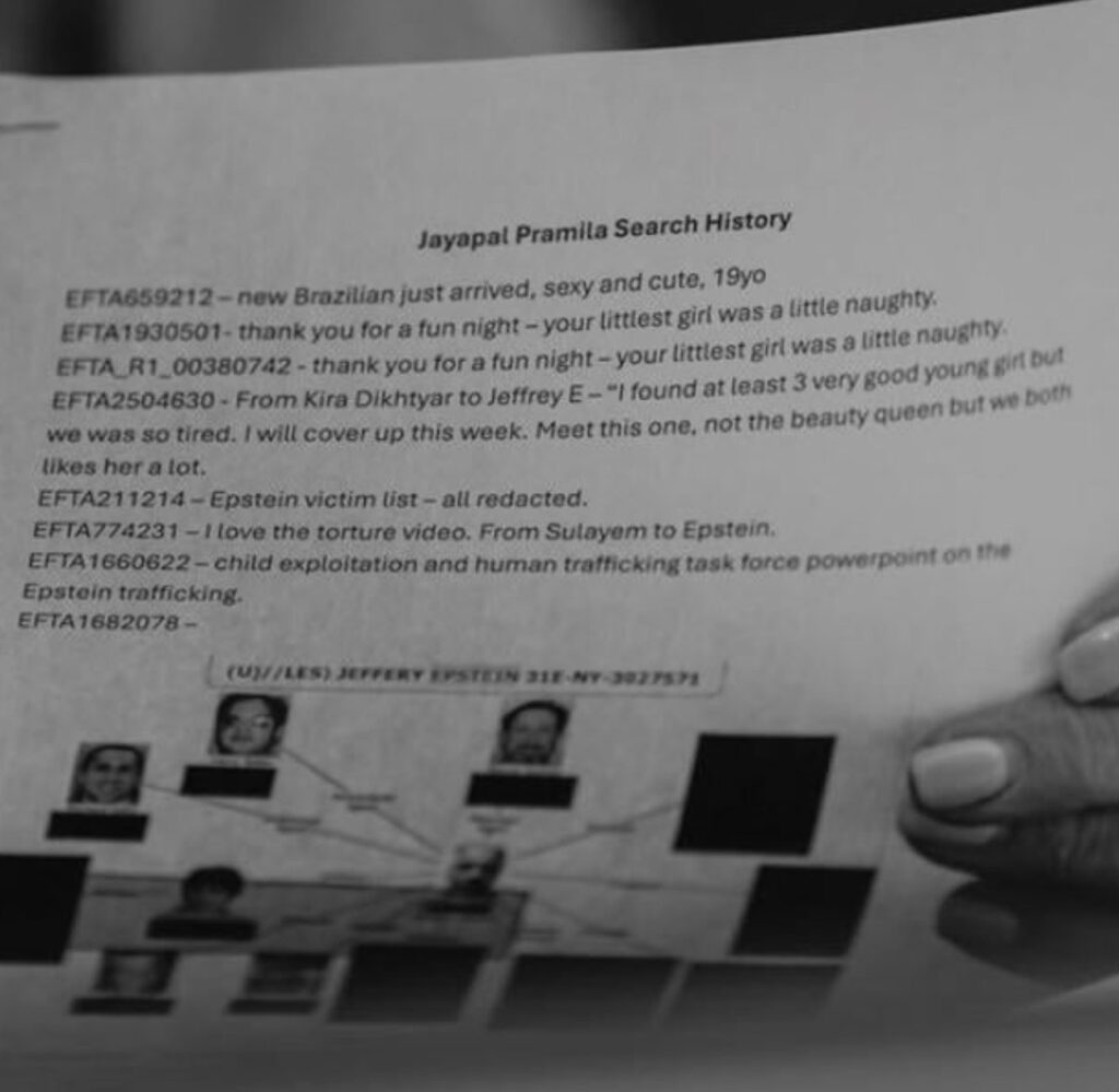 Let us set the scene. Representative Pramila Jayapal asked the survivors in the audience to stand and raise their hands if they had not yet been contacted by the Justice Department. All eleven raised their hands . Jayapal then requested that Bondi turn around, face the women, and apologize for her department releasing their personal information—in some cases revealing to their own families for the first time that they had been trafficked as minors.