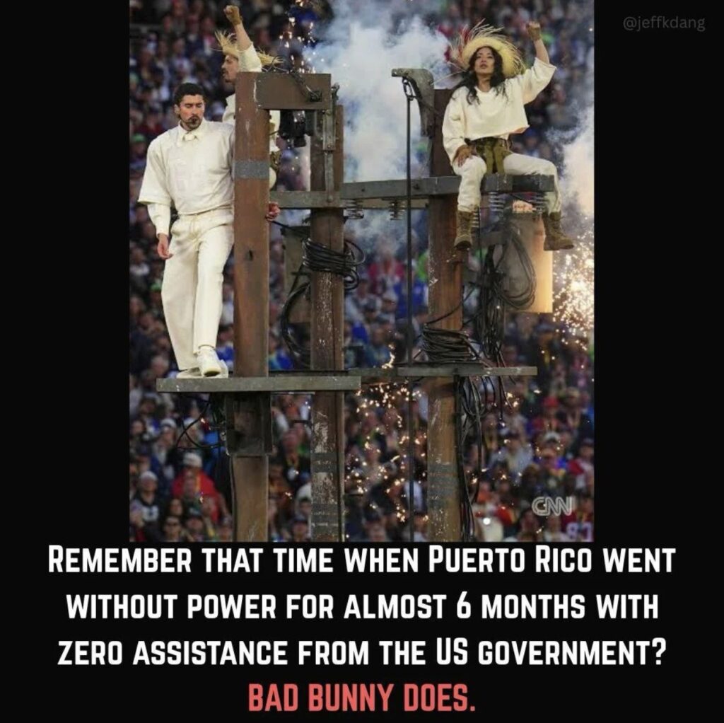 This is rich, coming from a man whose greatest contribution to musical culture was selling “God Bless the USA” Bibles during a campaign stop. Bad Bunny, real name Benito Antonio Martínez Ocasio, is literally a Puerto Rican citizen—meaning he is a U.S. citizen . He won Album of the Year at the Grammys just last week (an award Trump probably thinks is fixed, like everything else that doesn’t go his way). The performance celebrated Latin culture, featured migrants working in fields, and ended with a sign reading “The only thing more powerful than hate is love”—a sentiment that clearly doesn’t fit the “Make America Great Again” playbook .