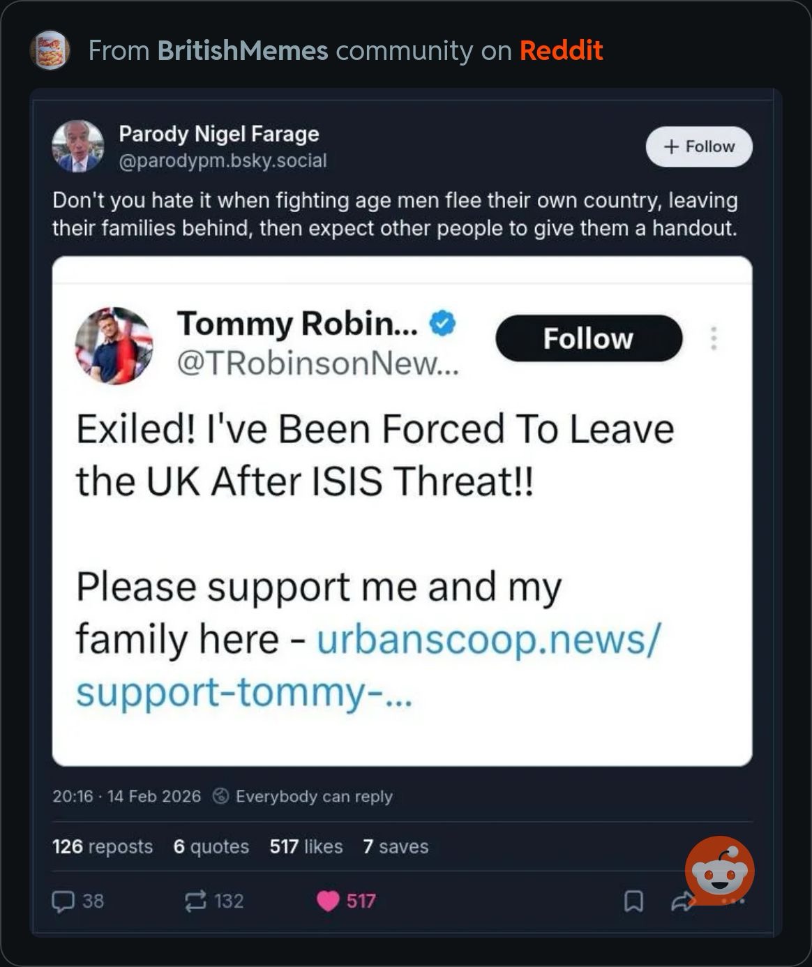 Following in the footsteps of the millions of migrants he has demonized, Robinson announced he had fled “for my safety and the safety of my family” . Yes, the man who built a career on telling others they don’t belong in Britain has now voluntarily banished himself from it. You really couldn’t script this level of cognitive dissonance, though we suspect Robinson will try to sell the movie rights anyway.