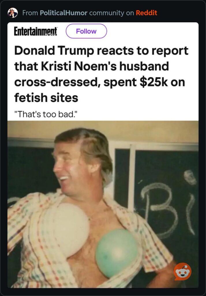 In what might be the most awkward family revelation since “The Apprentice” producers realized they’d have to edit around Donald Trump’s combover, the Daily Mail dropped a bombshell that has MAGA world pretending they suddenly care about privacy . According to the report, Bryon Noem—husband of the recently fired Homeland Security secretary—has allegedly been living a double life involving “bimbofication” fetish forums, $25,000 in payments to adult models, and a wardrobe that sounds like it was stolen from a drag queen convention .