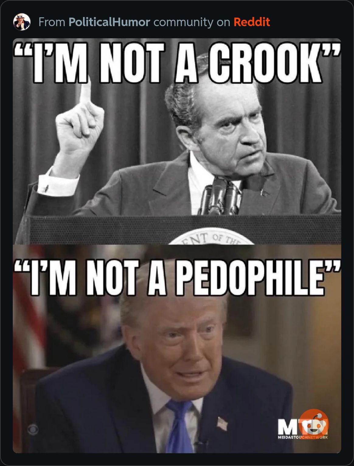 Congressional investigations have recently revealed that an accuser of Donald Trump received a payout from the late Jeffrey Epstein’s estate. Meanwhile, Trump’s own “best friend” status with Epstein is well-documented historically (Trump once called him a “terrific guy” who “likes beautiful women as much as I do”), a fact that merely adds context to why the word “pedophile” triggers him more than an actual assassination attempt does.